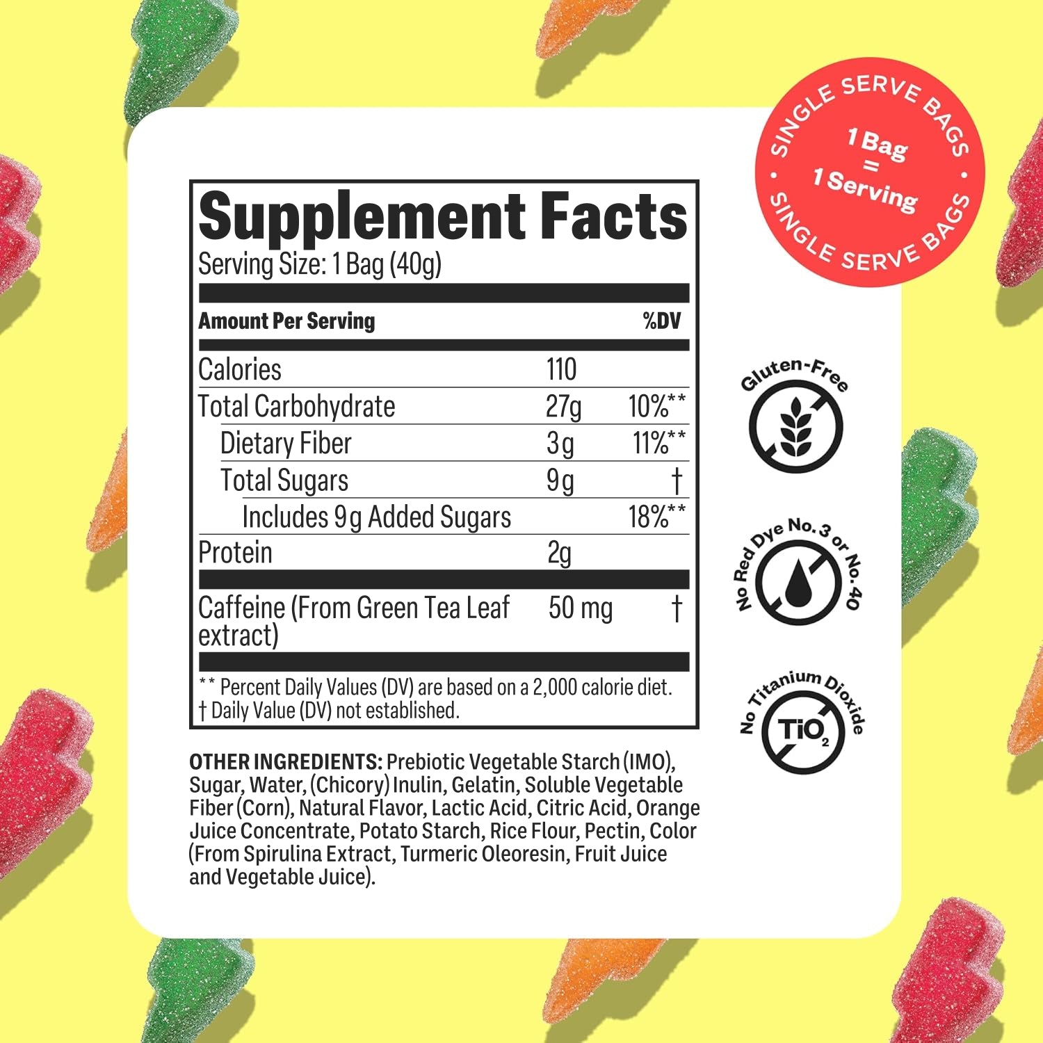 Caffeine (Green Tea Extract 50mg), Prebiotic Vegetable Starch (IMO), Sugar, Water, (Chicory) Inulin, Gelatin, Soluable Vegetable Fiber (Corn), Natural Flavor, Lactic Acid, Citric Acid, Orange Juice Concentrate, Potato Starch, Rice Flour Pectin, Color (from Spirulina Extract, Turmeric Oleoresin, Fruit Juice and Vegetable Juice).